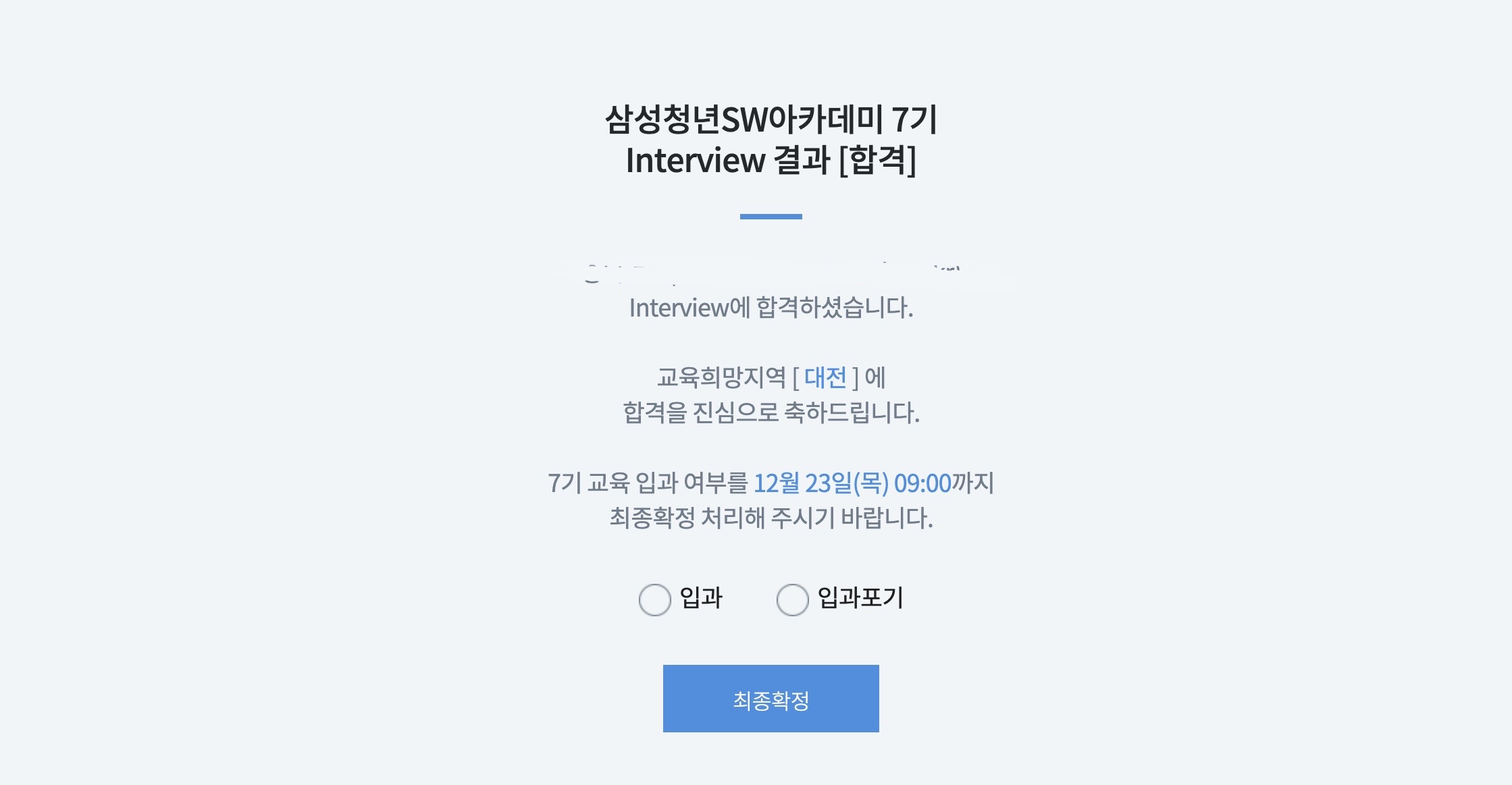급하게 준비했던 SSAFY 지원이었기 때문에 기대하지 않았었는데 좋은 결과를 얻을 수 있어서 정말 좋았다.