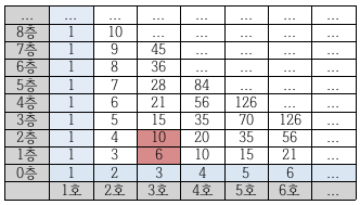 즉, k층 n호 = k층 (n-1)호 + (k-1)층 n호와 같은 식으로 구할 수 있다.