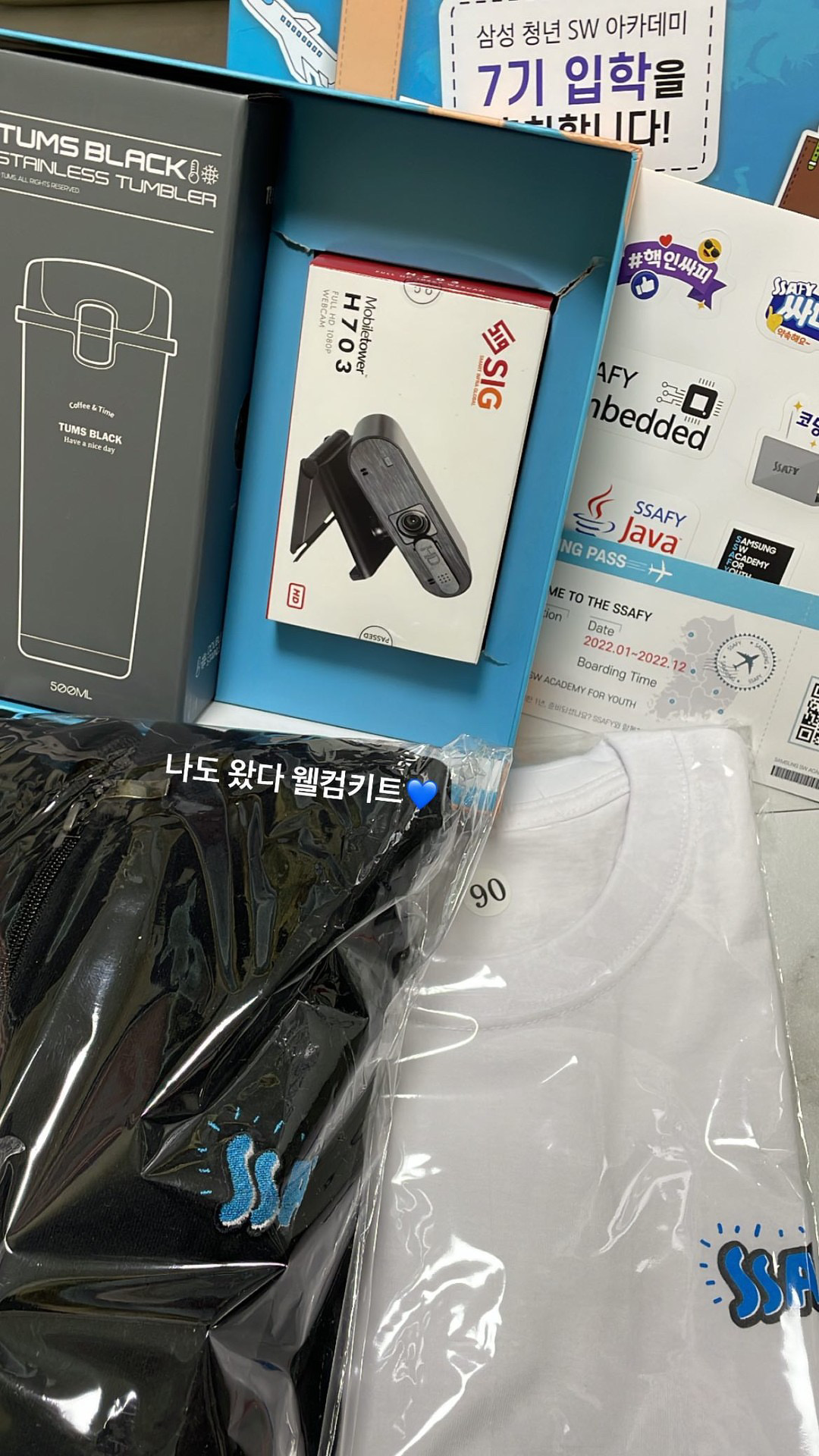 SSAFY 7기로 입학하면서 웰컴 키트를 배송받았다! 다른 사람들은 못생긴 파란 후드티를 받았다고 했는데 나는 검정 후드티라서 잠깐 외출할 때도 잘 걸치고 다녔고, 2학기에 캠퍼스로 나갈 때 가지고 다니며 잘 입었다 ㅎㅎ