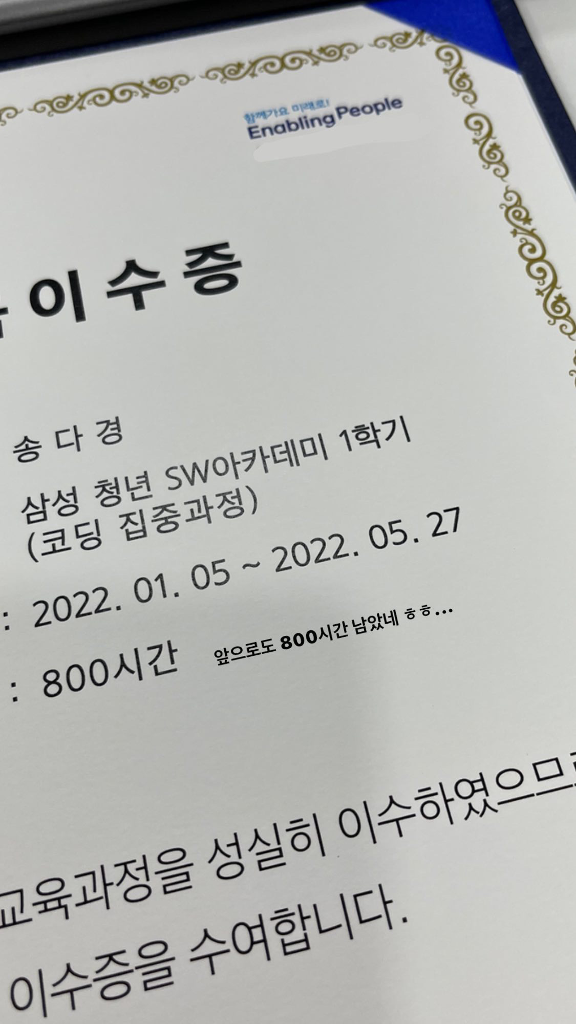 1학기 800시간, 2학기 800시간 무사히 SSAFY를 수료했다... 당장 취업을 원했던 것도 아니었고, 내가 개발자로 취업하기 위해 성장하고 싶어 지원했던 SSAFY였기 때문에 SSAFY 교육 중에는 취업 지원도 많이 안 하고 정말 SSAFY 교육 과정에 최선을 다했던 것 같다. 이제 취업 준비도 열심히 하고 취업하는 일만 남았다...!